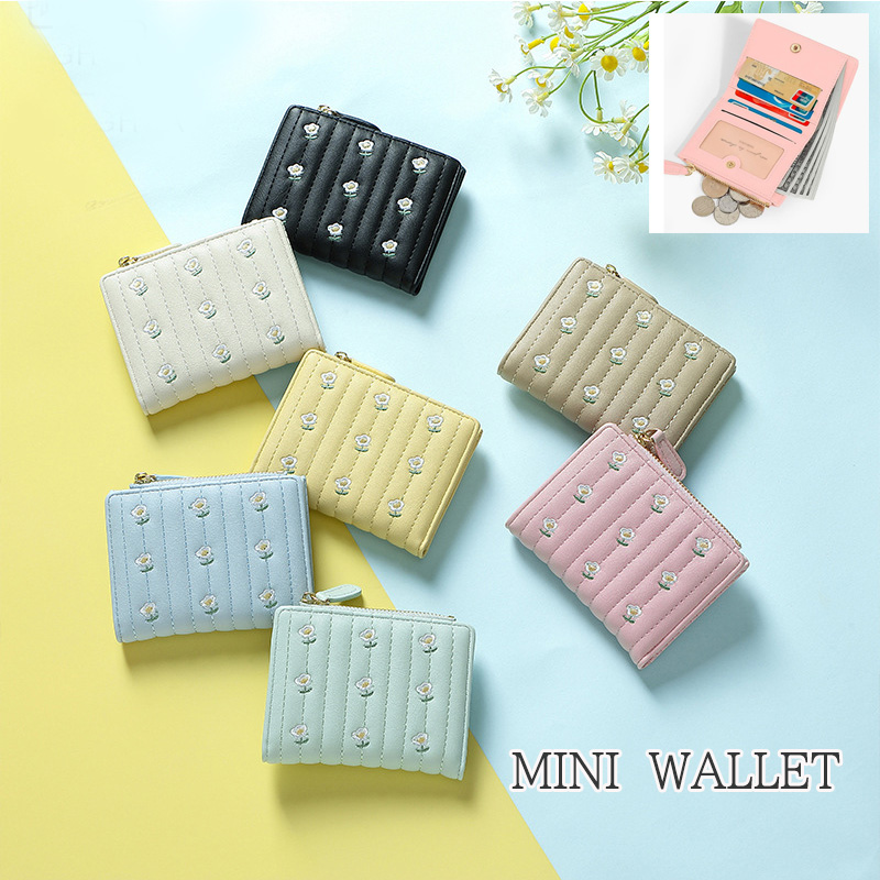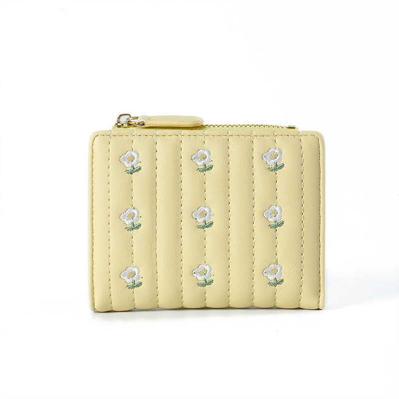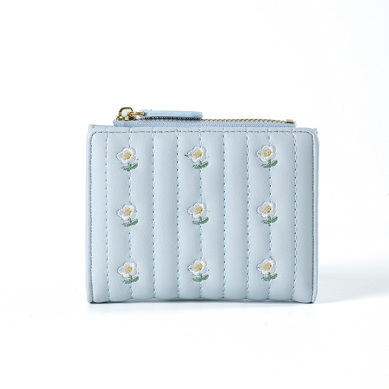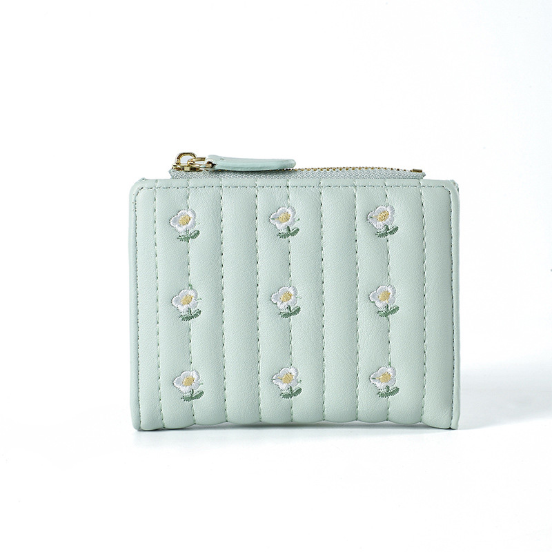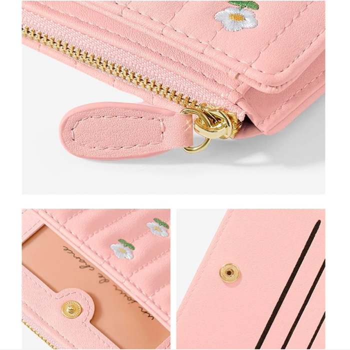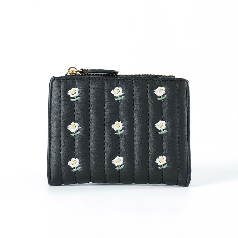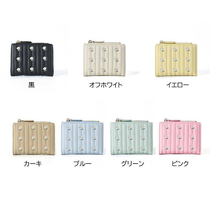 キルティング加工に美しい花の刺繍を施したコンパクト財布です。