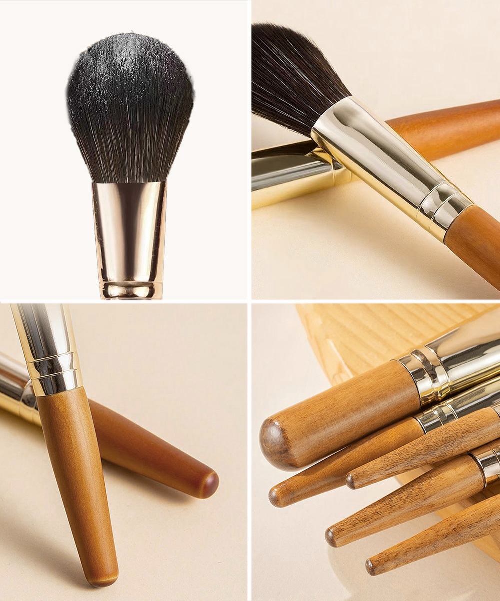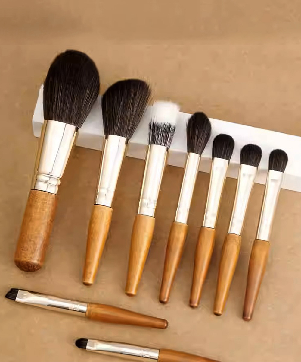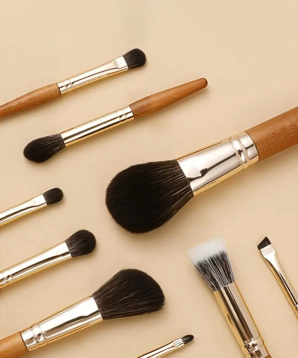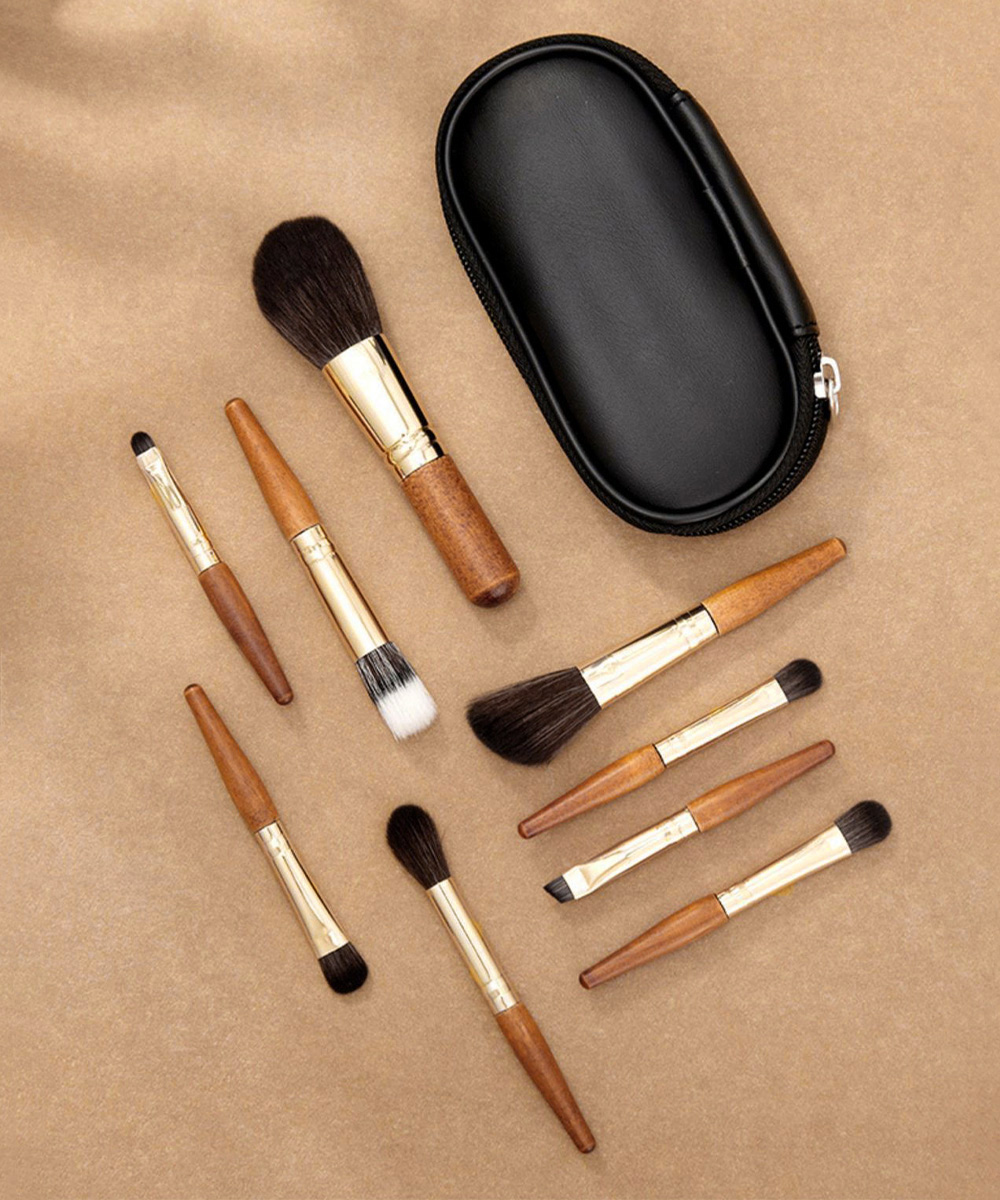 木製ハンドルの温かみと肌に優しいソフトな毛先が魅力の化粧筆9本セット。